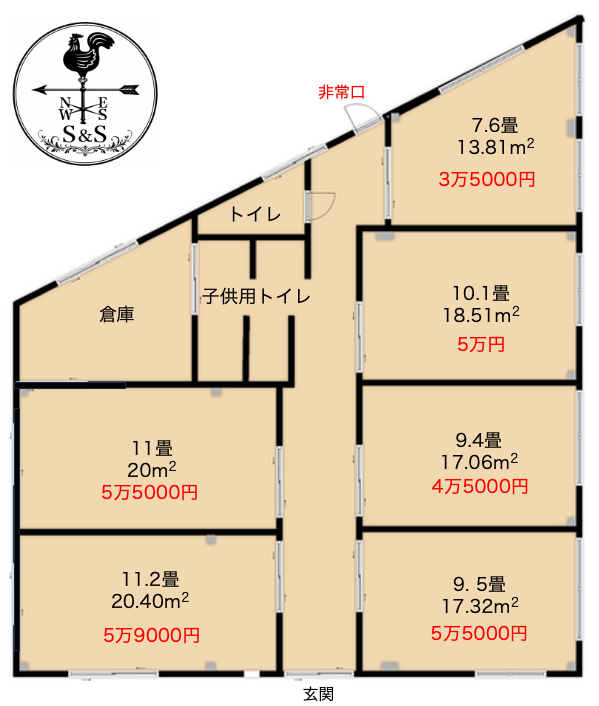 1)7.5畳〜12畳の使いやすいサイズの部屋を、現在6部屋ご用意しています。
