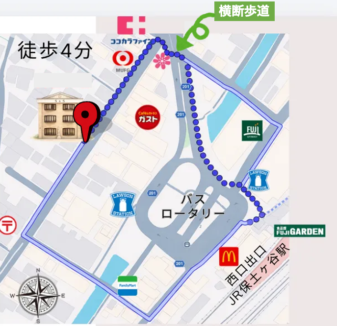 保土ヶ谷駅からの行き方は複数ありますが、ここでは地図の青い点線のルートをご案内いたします。