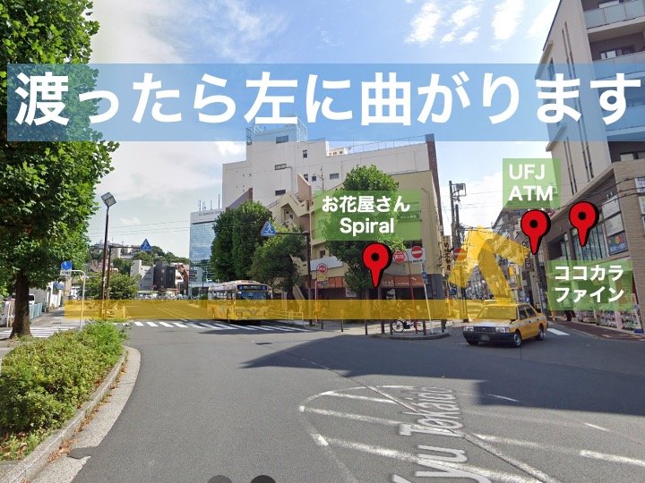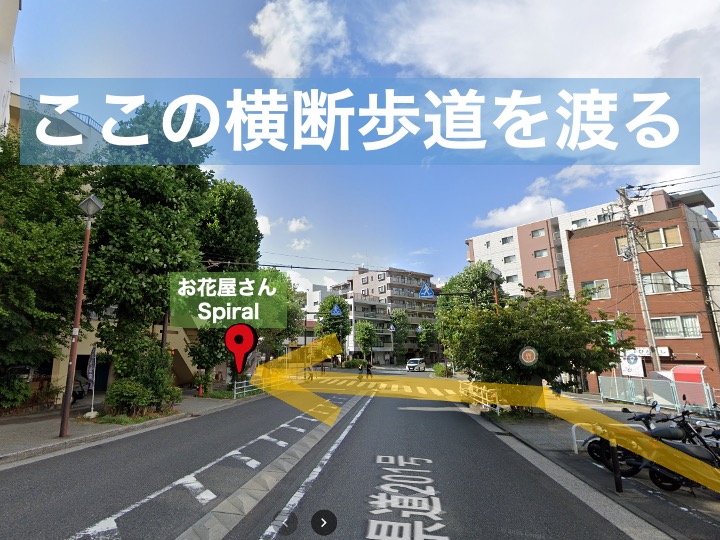 3)川を渡ってしばらく進むと交差点が見えてきますので、お花屋さん(Spiral)の方向へ横断歩道を渡ります。
