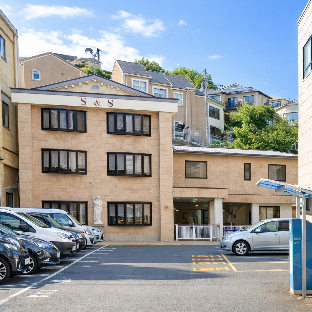 5)そのまま直進し、三菱UFJ銀行のATMを通り過ぎ、ライオンズマンションを過ぎると、右手に「NPC 24H」と書かれたコインパーキングの看板が見えてきます。看板の手前を右に曲がると、駐車場の奥に目的の建物がございます。